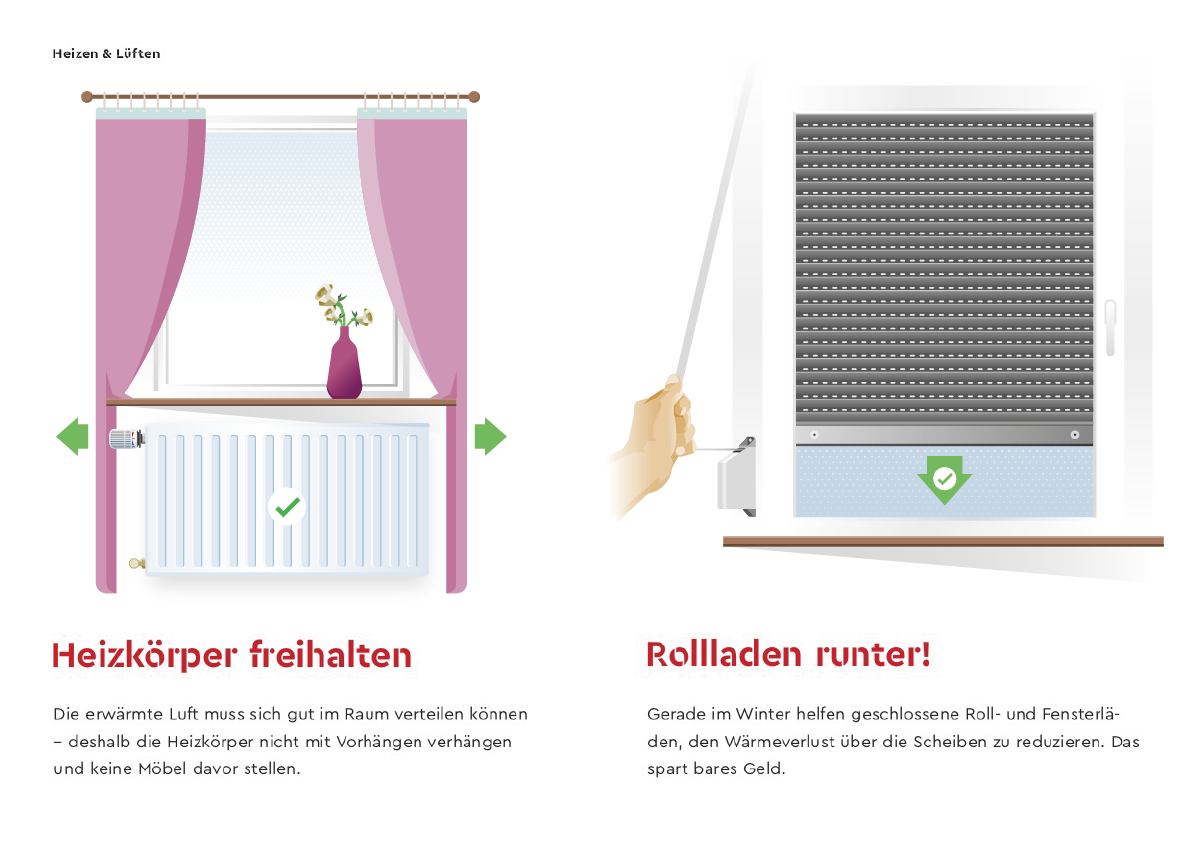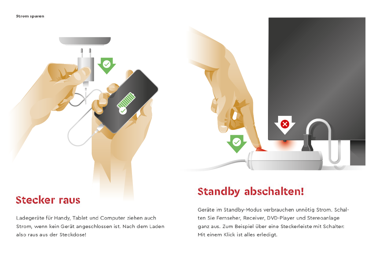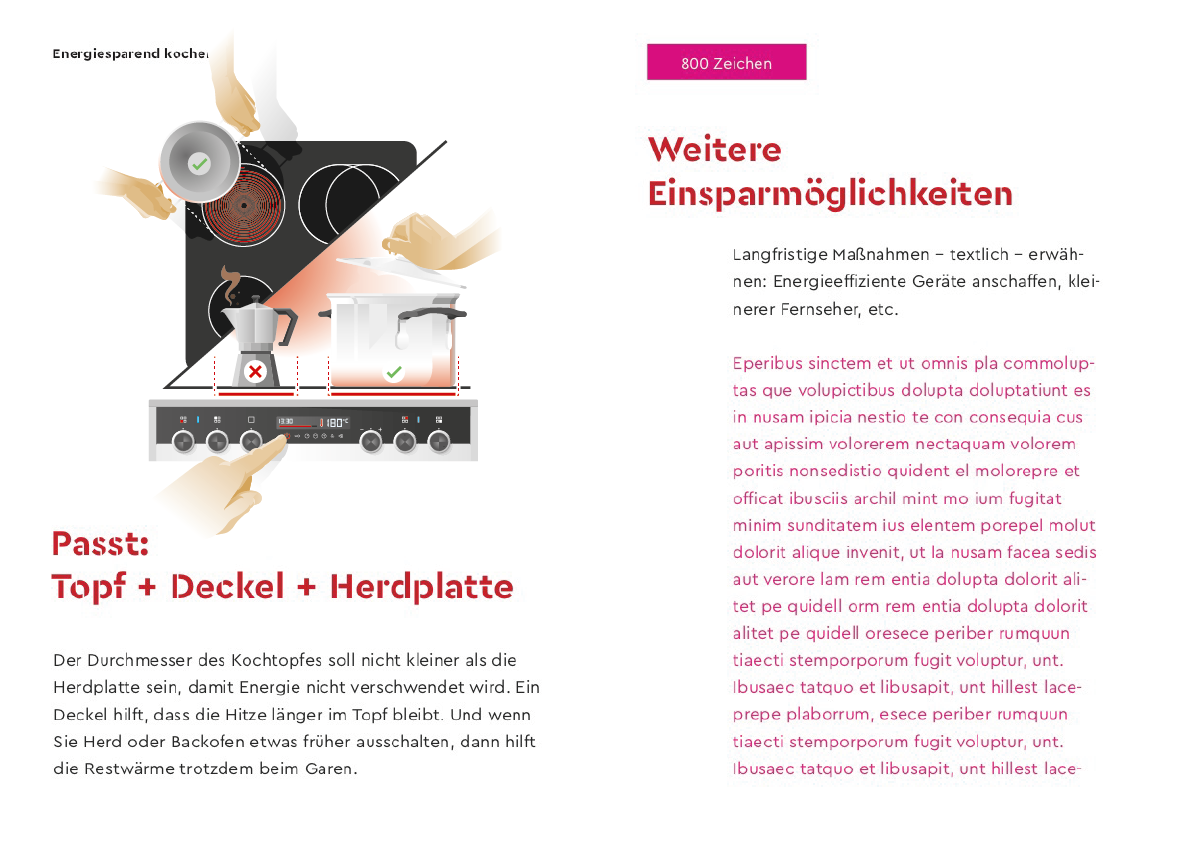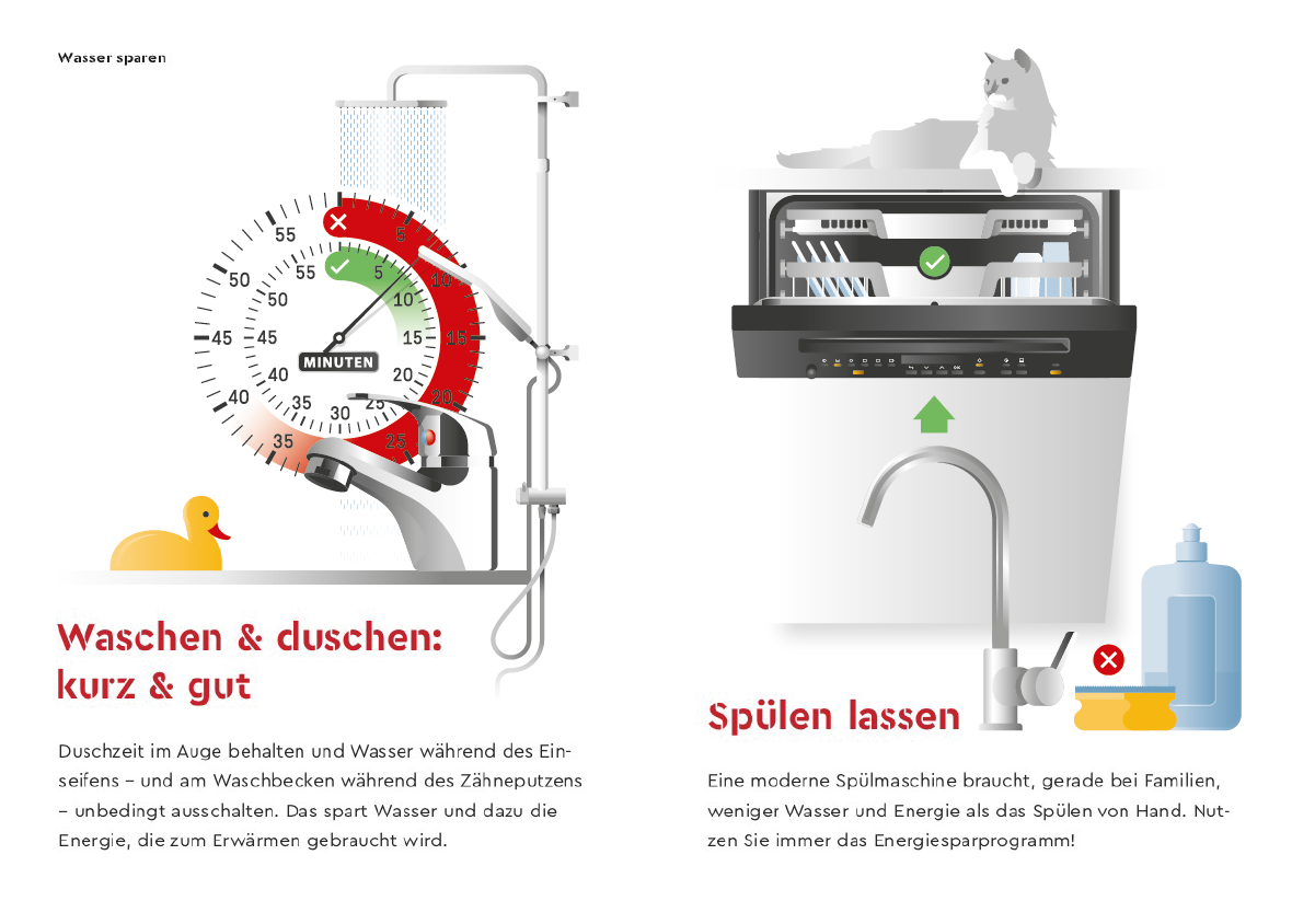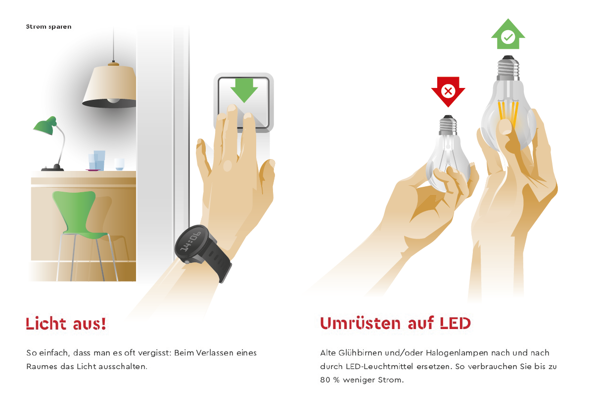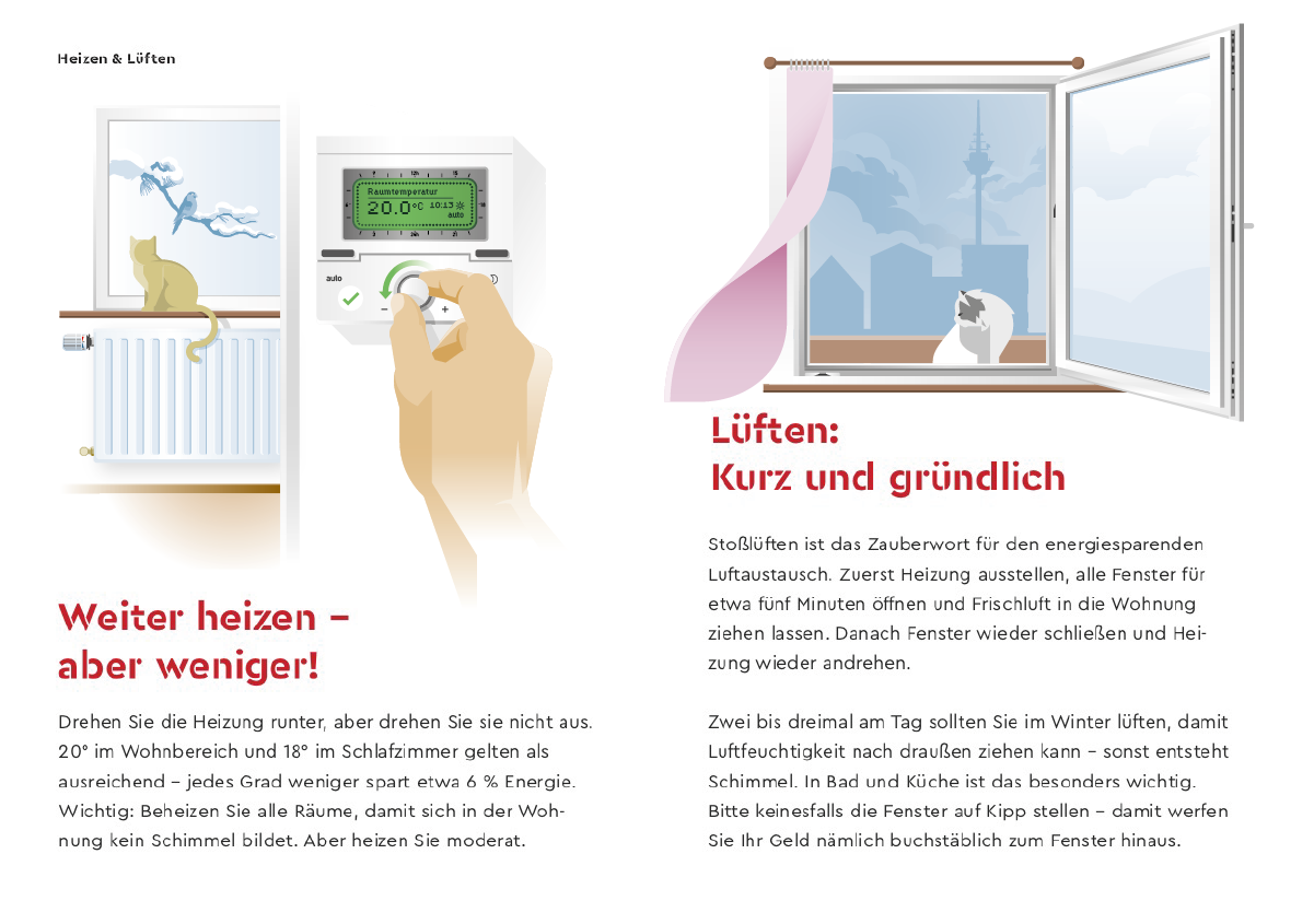 Minibroschüre Energiespartipps. Layout: Alexandra König-Maus. Illustration/Infografik: Steffen Mackert (superpfad)